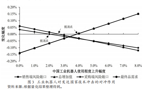 本文核心创新之一是量化了对冲效应阈值:中国工业机器人使用程度提升2.65%可抵消发达国家技术冲击对销售端风险敞口的影响,提升2.02%可抵消采购端影响;若提升至3.85%和3.87%,则可完全扭转其对总增加值和最终品需求的负面冲击。这一量化结果为中国应对全球技术竞争提供了明确的政策抓手。