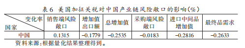 贸易壁垒是中国产业链面临的重要外部冲击,模拟结果显示,美国加征关税导致中国总增加值下降0.2535%,最终品需求下降0.2633%,销售端风险敞口上升0.1315%;采购端风险敞口微降0.0183%,但进口中间品增加值(-0.2816%)与最终品需求的降幅更为显著。这一结果表明:销售端风险上升源于出口受阻导致的总增加值大幅收缩;而采购端风险假性下降是被动“内向化”的结果,中国在全球价值链中的嵌入程度降低,并非产业链韧性提升,长期不利于经济可持续发展。