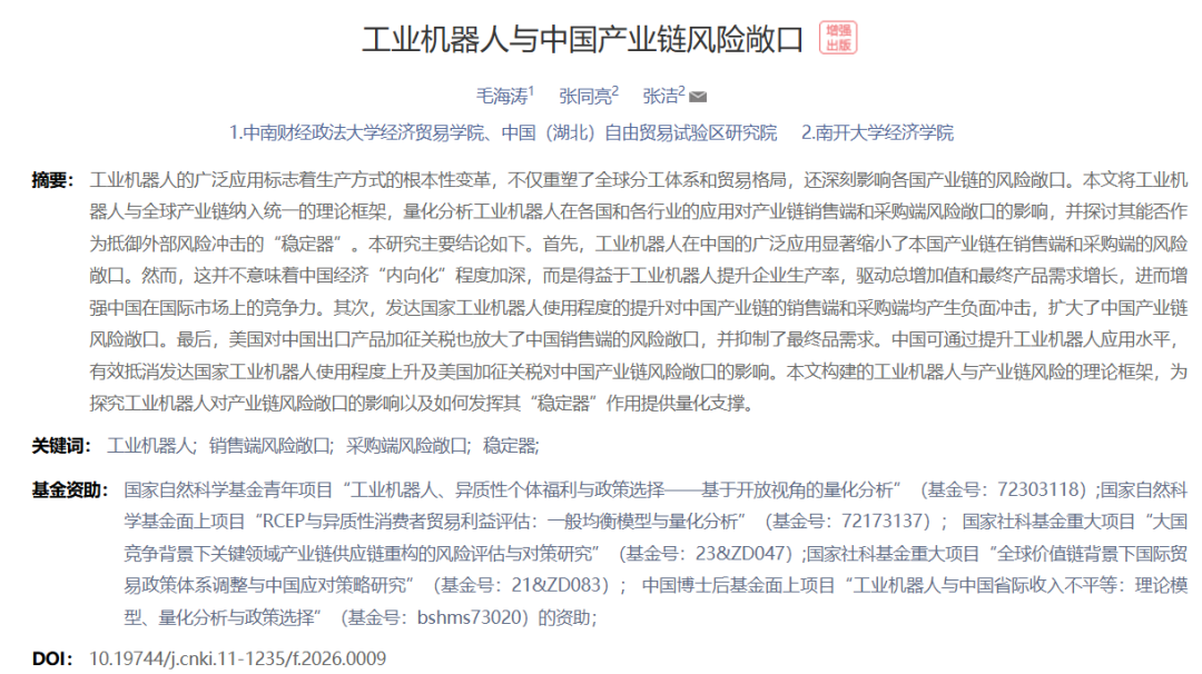 本文来自于《管理世界》2026年第1期,由中南财经政法大学毛海涛、南开大学张同亮与张洁合作完成。文章的突出亮点在于其高度统一的理论框架构建与系统严谨的量化模拟分析。作者创新性地将工业机器人使用纳入多国多行业的一般均衡模型中,从销售端与采购端双维度刻画产业链风险敞口,不仅从理论上厘清了机器人影响产业链安全的内在机制,更通过大量反事实模拟与稳健性检验,量化评估了工业机器人在应对外部冲击中的稳定器作用。全文数据来源丰富,涵盖OECD、IFR、ILO等多类数据库,模型设定严谨,实证设计完整,是一篇在方法论与政策启示上均具有重要参考价值的标杆性研究。