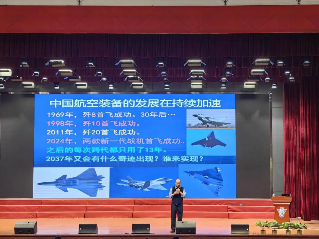 在讲述中国航空成就时,傅教授自豪地指出,我国在多种机型的研发与应用上已走在世界前列,为国防安全提供了坚实保障。他结合珠海航展的精彩场景,深入解读军机飞行表演背后的技术原理与协同智慧,让同学们深刻感受到航空科技的震撼力量与大国重器的非凡底气,现场掌声不断,民族自豪感在每一位学子心中激荡。