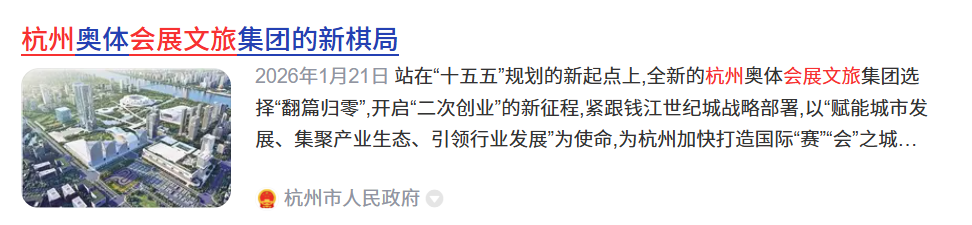 杭州:杭州会展集团(杭州市会展集团有限公司,2021年成立,2024年正式运营),围绕“百年西博会”和“全球数贸会”两大IP,打造数字会展标杆;杭州奥体会展文旅集团(2026年1月21日成立),整合亚运遗产,推动“赛演展商旅”融合,是杭州会展业的又一重要布局。