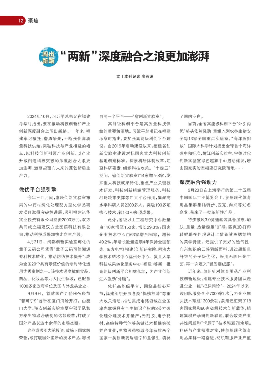 2024年10月,习近平总书记在福建考察时指出,要在推动科技创新和产业创新深度融合上闯出新路。一年来,福建牢记嘱托、奋勇争先,不断强化高质量科技供给,突破科技与产业相融的堵点,以科技创新引领产业创新、以产业升级倒逼科技突破的深度融合之浪更加澎湃,激荡起面向未来的蓬勃新质生产力。