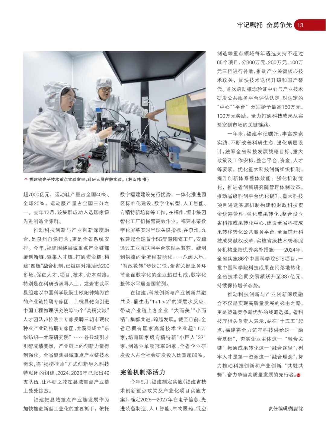 推动科技创新与产业创新深度融合不仅是实现高质量发展的必由之路,更是塑造竞争新优势的战略选择。省科技厅相关负责人表示,站在“十五五”起点,福建将全力筑牢科技供给这一“融合基础”,夯实企业主体这一“融合关键”,畅通成果转化这一“融合途径”,树牢人才是第一资源这一“融合理念”,努力推动科技创新和产业创新“共融共舞”,奋力争当高质量发展的先行者。