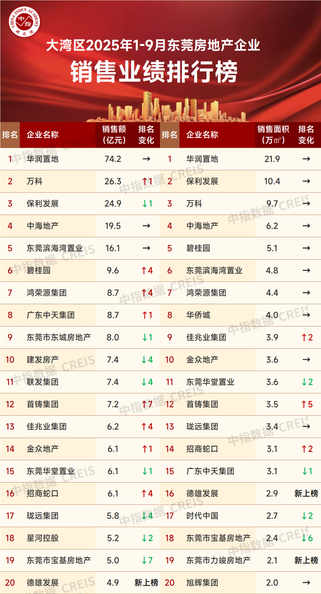 销售面积2025年1-9月东莞房地产销售面积TOP20企业合计销售102.8万㎡,入榜门槛值为2.0万㎡。华润置地、保利发展和万科分别位列全市前三位销售面积分别为21.910.49.7共有5家房企销售面积超过5万㎡。与1-6月销售面积排行榜相比,3家房企排名上升,4家下降,11家持平,2家新上榜。