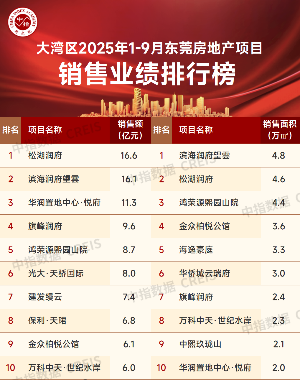 2025年1-9月东莞房地产项目销售金额前10门槛值为6.0亿元。前四位均为华润置地开发项目。位于松山湖板块的松湖润府以16.6亿元稳居榜首。位于滨海湾的滨海润府望云以16.1亿元位列第二。位于南城街道的华润置地中心·悦府11.3亿元位居第三。从上榜项目的开发企业来看,除华润置地项目占领前4位外,保利发展、万科、金众地产、建发房产等房企也有上榜。