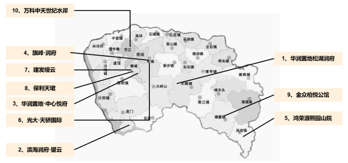板块分布:TOP10项目销售额榜单中,南城街道有3个项目上榜、东城街道有2个项目上榜其余项目分布在滨海湾、万江、凤岗、松山湖、塘厦上榜项目多分布在中心城区、产业发展片区及临深片区。
