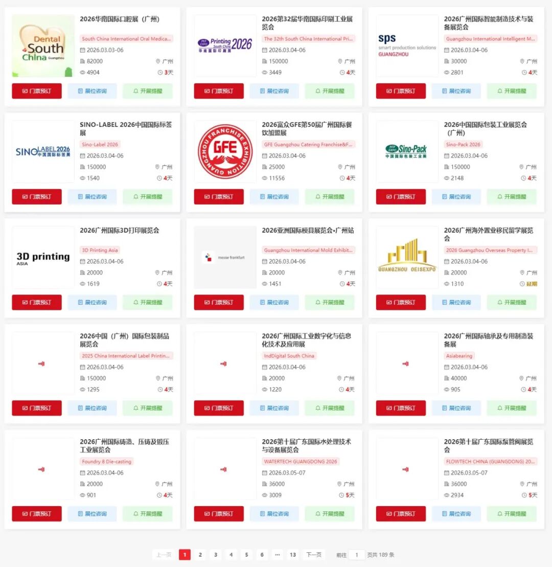 2026年广州将举办多场各行业展会,包含了环保、水处理、家博会、低空经济、酒店用品、清洁用品、动漫、口腔、包装、加盟、印刷、模具、智能制造、标签印刷、金融、3D打印、工业、锻造铸造、泵阀、婚博会、美容、广告、仪器设备、门窗、家居、礼品、加盟、烘焙、健康、服装、园林、游艇、花卉、餐饮、机器人、食品、宠物、跨境电商、环保、美发、汽车、啤酒、医药、酒业、渔业、食品、工业、船舶展等行业,小编已为大家整理好关于广州展会2026时间表+地点+门票,助你高效逛展。文末识别二维码,限时免费获取广州展会门票哦~