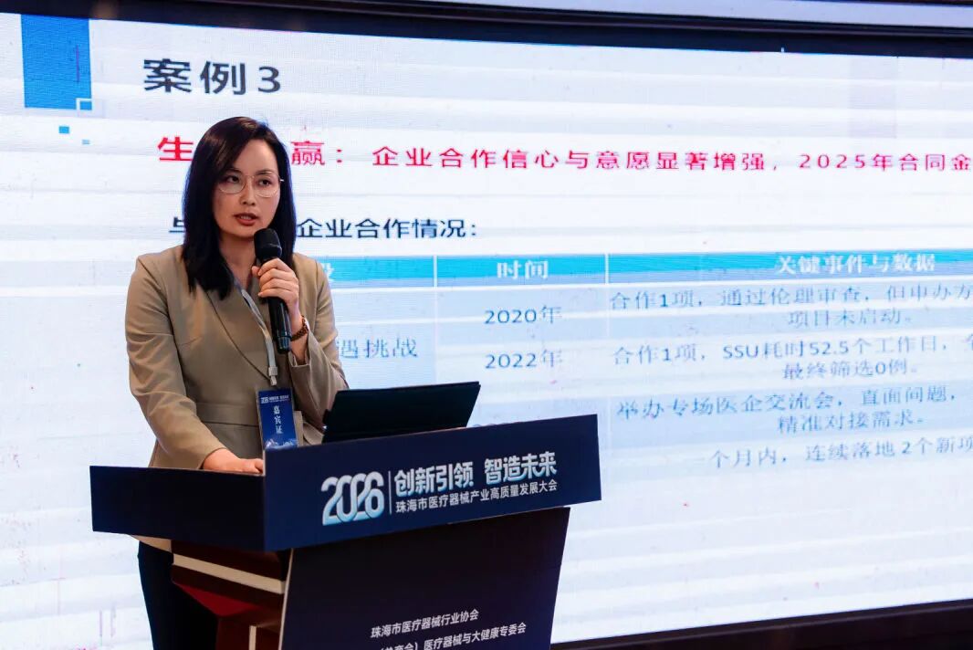 中山大学附属第五医院GCP办公室主任刘少璇以“破局临床试验痛点,构建产业生态共赢新格局”为题,分享了医院在加速临床研究、优化流程管理、深化医企协同方面的“五院模式”,为医疗器械高效转化提供了宝贵经验。