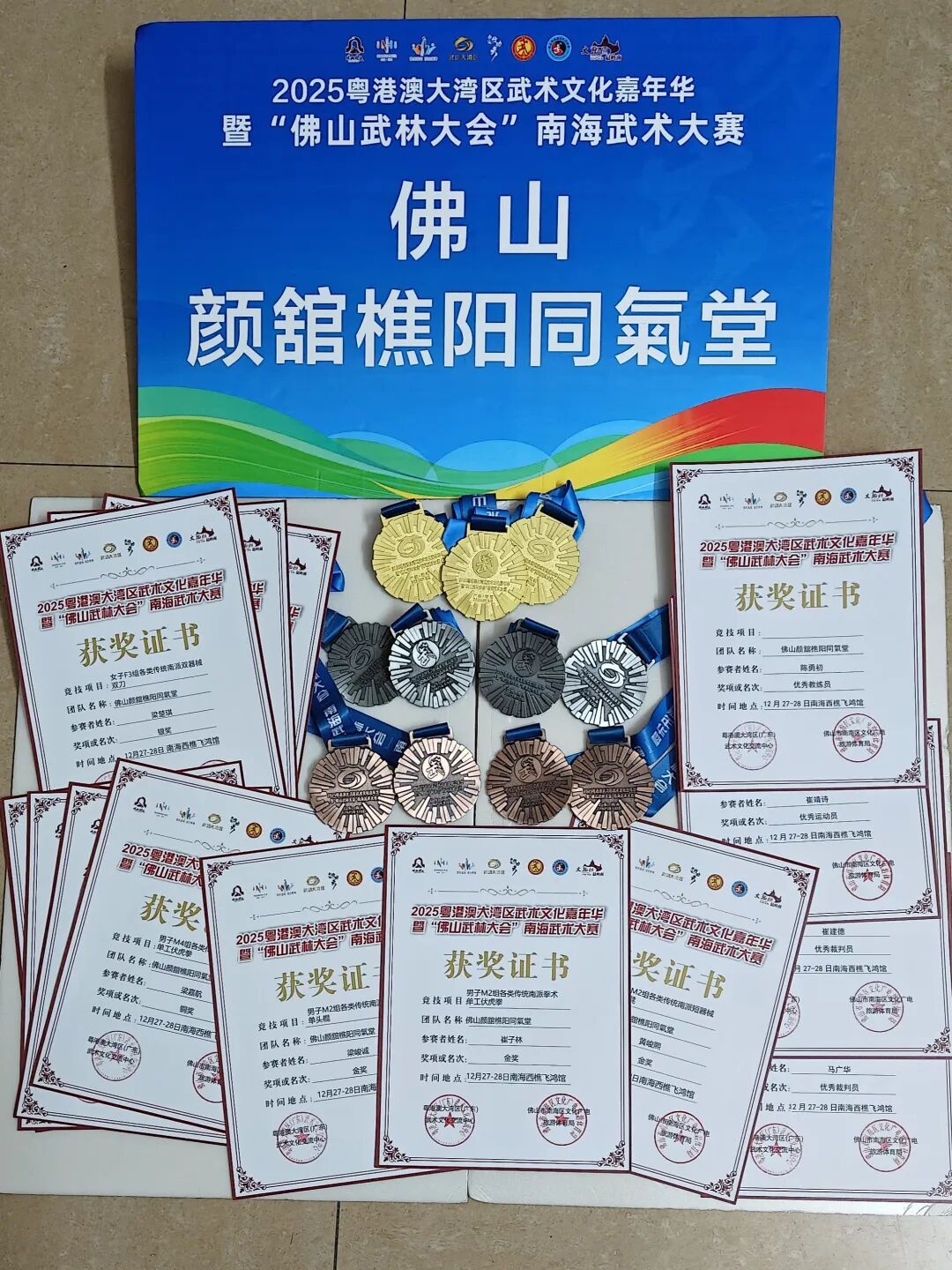 2025年12月27日至28日,备受瞩目的2025粤港澳大湾区武术文化嘉年华暨“佛山武林大会”南海武术大赛,在佛山南海西樵镇的武术地标——飞鸿馆隆重举行。本次盛会汇聚了粤港澳各城市共148支队伍、近2500名武术爱好者同台竞技,切磋武艺,共同弘扬中华武术文化。佛山颜舘山根樵阳同氣堂选派精兵强将参与此次武林盛会,并以出色的表现与精湛的技艺,斩获丰硕成果,载誉而归!精英出战,成绩斐然