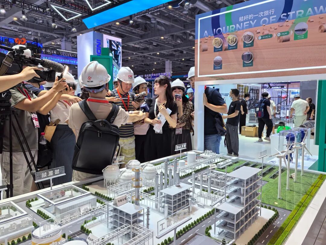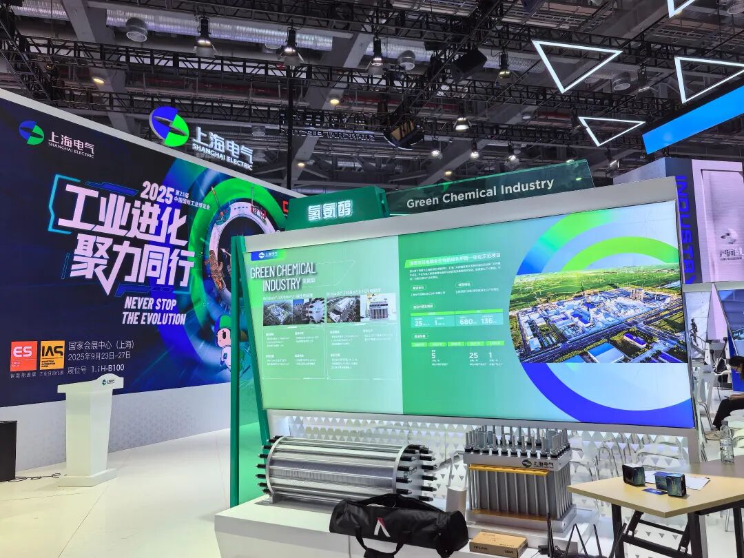 在上海电气展台,模拟吉林洮南全球首个风电耦合生物质绿色甲醇一体化示范项目的沙盘模型引人注目。
