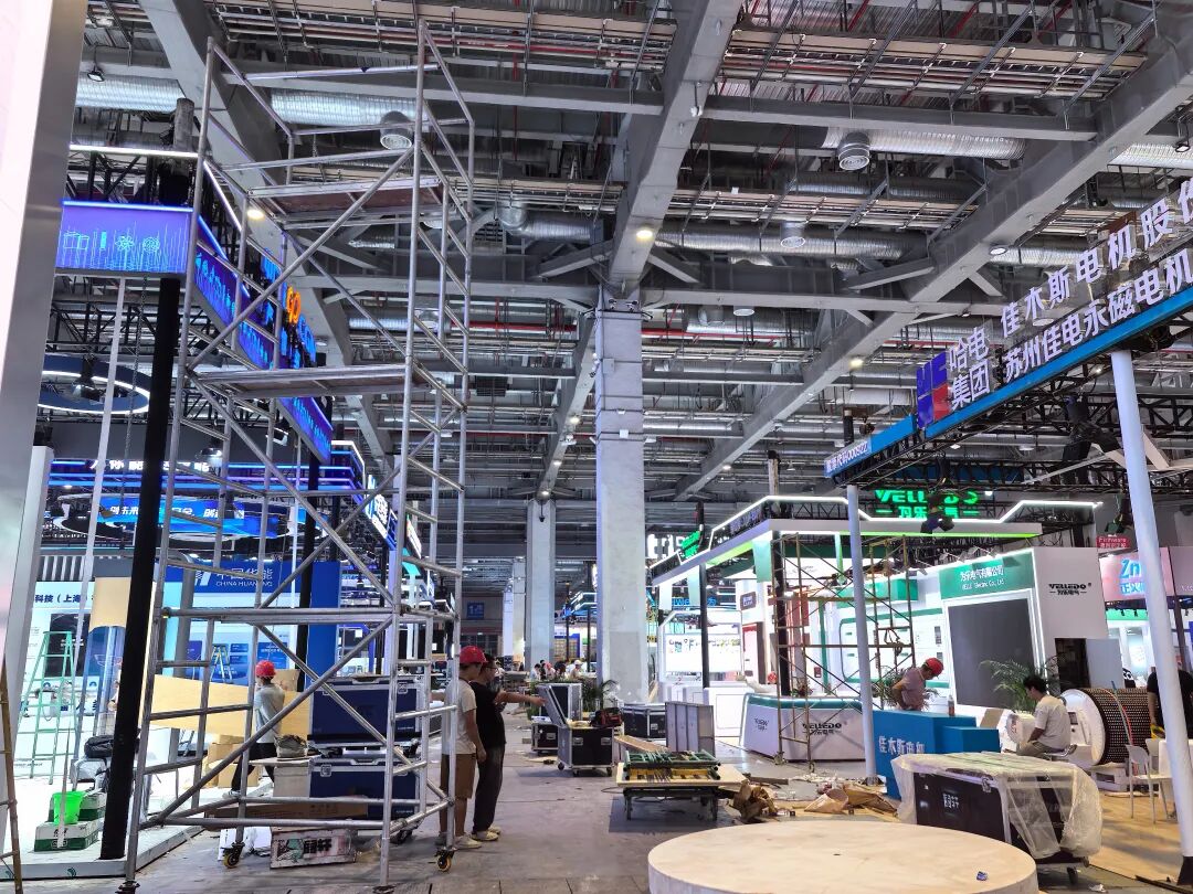 记者在场馆看到,各个展台搭建现场一派热火朝天的繁忙景象,工人们正争分夺秒进行最后的搭建与调试工作。