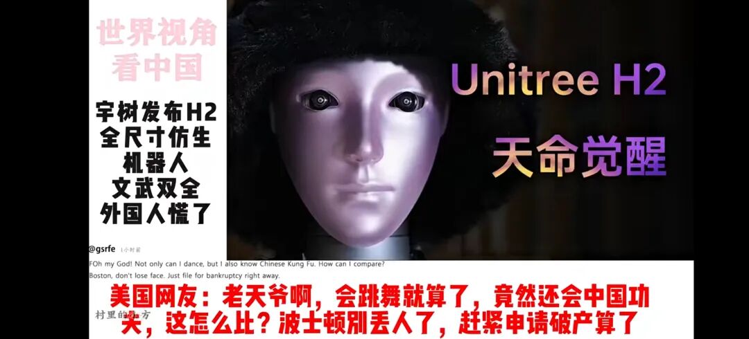 2025年10月20日,宇树科技发布最新人形机器人产品 Unitree H2(H2 仿生人),高180cm、重70kg。与前代产品相比,H2在外观上增加了仿生人脸。无论是表演流畅的舞蹈,还是展示复杂的武术动作,H2都表现出远超前代的稳定性与灵活性,其全身关节运动连贯、协调性高,动作姿态显得十分自然。