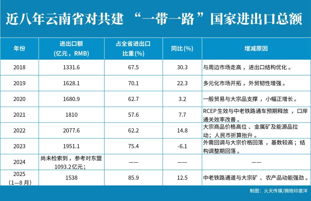 9月的云南,迎来国际高光时刻。同一周,连开两场“重量级”会议。9月16日,2025一带一路媒体合作论坛在昆明开幕。87个国家地区、200余位外方代表同场对话,这是2014年以来首次选址昆明。15日,2025年国家网络安全宣传周启幕,同期举行了昆明国际通信业务出入口局贯通互联启动仪式,释放重磅消息,数字信息大通道转入实操阶段。一边是科技创新的硬支撑,一边是文化合作的软连接。是昆明这座“壮丽大城”的AB面,也是当下云南开放新格局的双重维度。共建“一带一路”倡议已然提出十二年,沿着“一带一路”,云南做了什么、又获得了什么?云南与“一带一路”国家贸易已成为云南外贸的主赛道,占比长期维持在六成上下,年均增速约8%,通道效应与结构优化共同抬升“量”和“占比”。十二年来,云南服务和融入共建“一带一路”倡议,向建成面向南亚东南亚辐射中心不断发力。如今随着11个国家南向开放平台叠加赋能,迎来万物勃发的大时代。最直观的成果,便是国际大通道。“七出省五出境”高速公路网、“八出省五出境”铁路网、“两网络一枢纽”航空网、“两出省三出境”水路网。中老铁路飞驰南下,中缅铁路国内段昆明至保山、大理至临沧贯通;中老高速万象至万荣段正式通车,陆路通道格局愈加清晰。空中,云南与南亚东南亚通航城市已达43个,数量高居全国首位。水路愈加顺畅,澜沧江—湄公河国际航运、水富港多式联运蓬勃发展。能源动脉也在不断延伸,中缅油气管道已成为我国第四大陆路能源进口通道;中老500千伏电力联网工程全线开工,跨境电网数量和输电能力跃居全国第一。通信领域更是跨越升级,昆明跃升为全国第四个汇聚三大运营商国际通信局的城市,国际通信服务覆盖越南、老挝、缅甸、泰国等8个国家。中老铁路作为标志性工程,开通4年来货运已覆盖19个国家,运输商品超过3300种。曾经被质疑“无货可拉”、被担心“无人乘坐”的中老铁路,如今十分繁忙。昆明海关统计,今年上半年云南对东盟农产品进出口额达186.2亿元,同比增长23.5%,其中超过一半的铁路货物通过中老铁路完成运输。通道成网,人气自然给出答案。昆明长水机场今年8月19日创下单日旅客量16.8万人次的历史纪录。暑期在全国前十机场中,昆明机场旅客增速位列第一。1至8月,云南入境游客人次、入境过夜人次已接近2024年全年水平;旅游外汇收入同比增长141.3%,大幅超过2024年全年收入。全省旅居人数达380.1万人,接近2024年全年389万人的规模。入境免签政策扩容后带火“China Travel”,入境游强劲得出乎意料。虽然有些行程不走云南旅行社,但从消费行为看,云南正成为外国游客认识中国的重要窗口,升级为生活与消费的目的地,国际能见度与承载力同步抬升。南博会是平台。第九届南博会73个国家、地区,2510家企业到场,境外企业数量增长20.9%,嘉宾层级与规模双双刷新纪录。121家世界500强与行业龙头集中亮相,包括亚马逊、麦德龙、盒马鲜生等3000余名采购商把“展”做成“单”。口岸是入口。“1+3+4+N”口岸布局清晰,以昆明国际枢纽口岸为核,磨憨、河口、瑞丽三大龙头,外加多节点协同,把区位优势变成流量优势。贸易有结构。今年前8个月,云南对共建“一带一路”国家出口农产品105.8亿元,增长7.1%,占云南对共建“一带一路”国家出口总值的22%。产业有抓手。通过中老铁路,云花、云果、云蔬运往南亚东南亚,昆明成为中国重要的热带水果集散地,也正在花大力气打造着“东南亚水果交易集散中心”。而普洱咖啡与泰国正大集团联手打造东南亚咖啡集散地,推动咖啡交易人民币国际化结算,这才是云南想要的,成为产业体系的中心。这里最动人的,是省委书记王宁在开幕式上分享的四张照片。中老铁路“郑和号”班列首发、云南省和印尼巴厘省有机稻米合作示范项目、外国青年文森特在昆明创业安家、云南救援队赴缅甸开展地震救援。“物”的流动,再到“人”的往来,最终到“情”的共鸣,这正是“一带一路”的特别之处,应潮流、得民心、惠民生、利天下,“投我以木桃,报之以琼瑶”。“一带一路”媒体论坛选择云南,本身就是对云南“开放格局”的再肯定、再确认。谁来讲述、在何处讲述、讲给谁听?答案在云南。9月16日,在2025年国家网络安全宣传周期间,举行了昆明国际通信业务出入口局贯通互联启动仪式,标志着项目正式进入运营准备阶段。它是国内运营商网络与境外网络的国家级互联节点,过去30年只在北上广开通互联网业务节点。2024年7月工信部批复在昆明等地新设,这是30年来全国首次增设,更是国家首次在中西部内陆地区设立出入口局,意义重大。因为,云南不止“有了一个点”,而是“拿到了一条链”。昆明市委书记刘洪建的判断准确:昆明是“数字云南”建设的核心枢纽,也是全省条件最好、产业基础最强的城市;有了国家一级节点,低时延、广覆盖、高稳定的底座,足以把数字产业的可能性逐一点亮,昆明迎来重大机遇。官方披露,出入口局与北上广同级互联后,重庆、四川、贵州等西部省份到南亚东南亚的网络时延,最高降幅超50%;昆明—新加坡从约78ms降到42ms,几乎“腰斩”。时延被切半,带来的是三条曲线同时下移:成本曲线、故障曲线、体验曲线。对云计算、跨境电商、音视频会议、在线教育、游戏分发、金融科技乃至工业物联网,是一场“看不