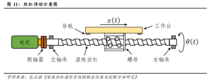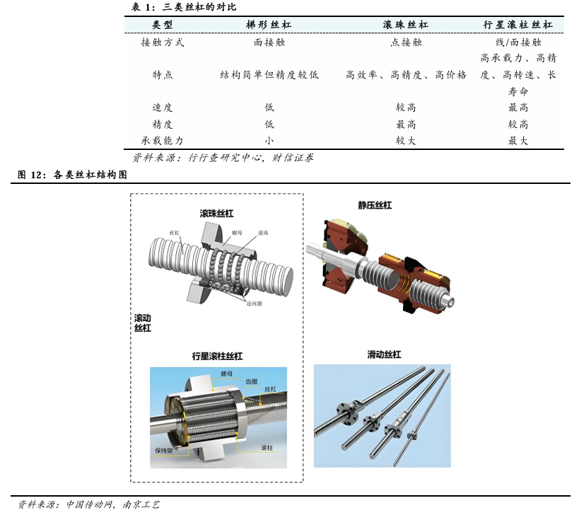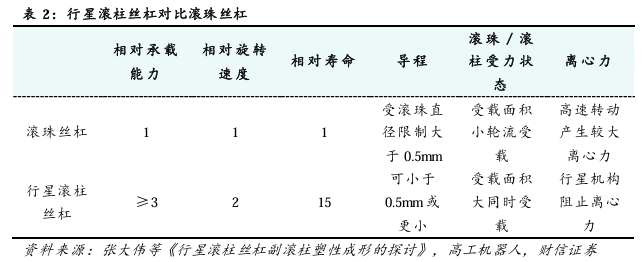 行星滚柱丝杠性能优异,长期而言是最佳传动解决方案。行星滚柱丝杠与滚珠丝杠的主要区别是行星滚柱丝杠负载的传递单元使用螺纹滚柱而不是滚珠,能够承受更高的静态负载和动态负载,静载为滚珠丝杠的3倍,寿命为滚珠丝杠的15倍。同时,具有更强的刚度和抗冲击能力,可以提供更高的转速及更大的加速度。此外,行星滚柱丝杠为螺纹传动,螺距设计范围更广,行星滚柱丝杠的导程可以比滚珠丝杠更小。