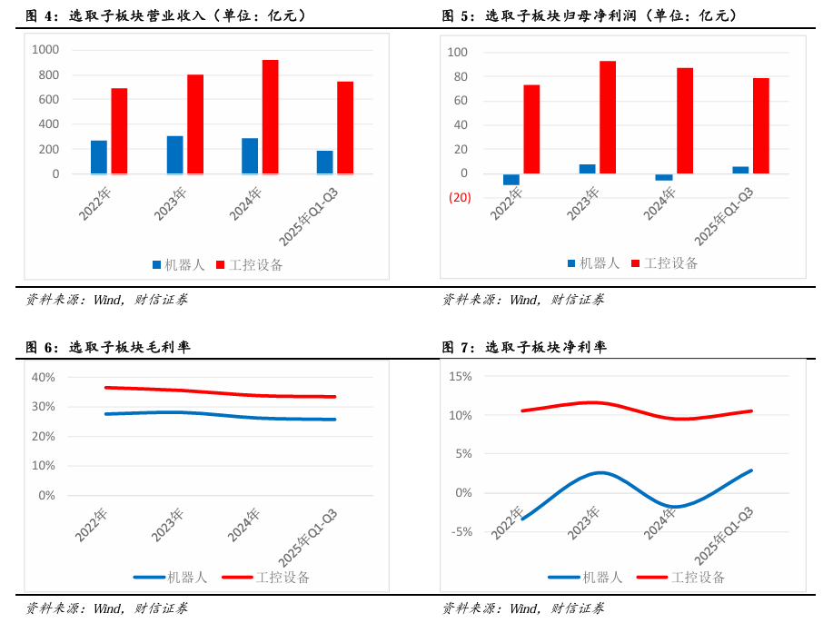 机器人板块营业收入表现较为稳定,但净利润表现稍逊,我们认为主要系机器人企业前期投入较多所致,反映行业尚处成长期,供需不平衡与高端产品短板导致盈利稳定性较弱。未来需关注人形机器人商业化进展及核心零部件国产替代。工控设备营收稳步增长,归母净利润仅有2024年微降,尽管受竞争与成本压力影响行业毛利率逐年略微下滑,但2025年前三季度降幅趋缓,在制造业自动化升级的长期需求支撑下,行业具备较强的盈利韧性。整体而言,我们选取的两个机器人相关子板块表现较为平稳,虽然利润率表现不稳定,但营收和利润整体处于稳中有增的态势。