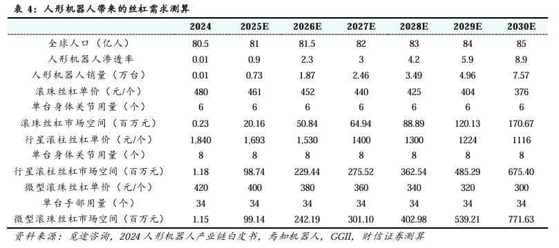 人形机器人带动丝杠市场需求扩容。传统滚珠丝杠作为核心传动部件,在人形机器人初期考虑到性价比,会有较多使用场景,身体丝杠和手部丝杠方案我们均以特斯拉Optimus为例,因此身体丝杠用量为6(滚珠)+8(行星),手部自由度为17个主动自由度+5个被动自由度,对应执行器数量为17+5个,我们只考虑每个主动自由度的执行器配备一根微型滚珠丝杠,因此双手共34根。我们预计2030年人形机器人带来的传统滚珠丝杠市场规模将达到1.71亿元。但长期来看,考虑到性能瓶颈,人形机器人未来如果追求性能,将会更多使用行星滚柱丝杠,预计2030年仅人形机器人带来的行星滚柱丝杠规模到达6.75亿元,而手部丝杠则贡献了最多的需求,2030年微型丝杠市场规模为7.72亿元。