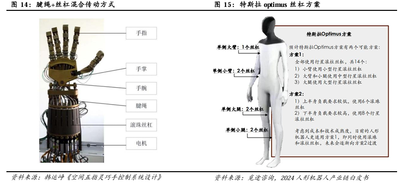 特斯拉optimus的设计需求高精度丝杠。根据觅途咨询发布的《2024人形机器人产业链白皮书》,特斯拉optimus的暂定方案中,预计使用14根丝杠,其中至少有8根为高标准高精度的行星滚柱丝杠。