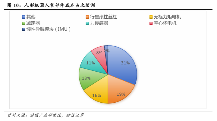 零部件方面占比较高的为丝杠、电机和减速器环节。行星滚柱丝杠在理论上是传动领域的最优选择,根据前瞻产业研究院数据,行星滚柱丝杠在未来成本占比重有望达到19%,位居第一。电机作为任何机械产品的核心零部件,在未来成本占比中有望达到16%,位居第二,减速器作为人形机器人手臂、腕部等轻负载关节的关键部件,在未来成本占比有望达到13%。