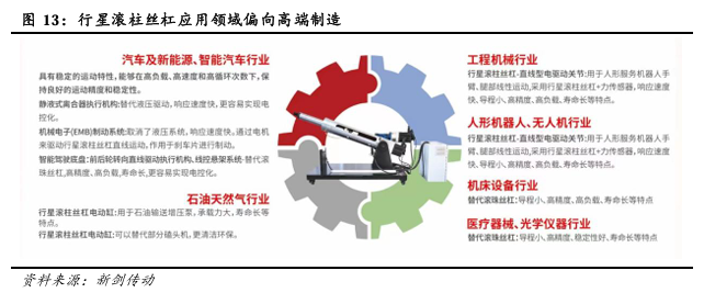 相较于传统滚珠丝杠,行星滚柱丝杠应用领域更偏向于高端制造。在传统机床和医疗器械及光学仪器领域,行星滚柱丝杠由于导程小、精度高、高负载高寿命等特点,在高端领域相比传统滚珠丝杠有更好表现。在汽车领域,行星滚柱丝杠的性能优势有助于更好电控化,并且能够优化EMB系统。在石油天然气领域,除了传统的优势,更有清洁环保的功效。而在人形机器人和无人机等新兴领域,由于其产品对精度的高要求,传统滚珠丝杠不一定能完全满足要求,因此行星滚柱丝杠则是其最终选择。