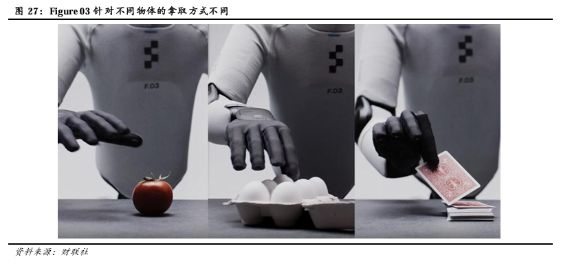 Figure 03发布,在手部环节作出较多革新。2025年10月Figure发布其新一代产品Figure 03,主要包含以下革新。①Helix:Figure 03配备了一套全新设计的传感器套件和手部系统,专为驱动Figure专有的视觉-语言-动作人工智能Helix而打造。②家庭:Figure 03增添了多项新功能,包括软性部件、无线充电、用于语音推理的音频系统,以及提升电池安全性,使其在家庭环境中更安全、更易用。③大规模制造:为了扩大规模,公司在BotQ工厂建立了一条全新的供应链和一套全新的人形机器人制造流程。④手部系统与传感:Figure 03 的每只手都集成了一个嵌入式掌心摄像头,具有宽视场角和低延迟传感特性,可在抓取过程中提供冗余的近距离视觉反馈。公司自主研发了第一代触觉传感器,根据技术规格,每个指尖传感器能检测到最小3克的压力变化,其灵敏度相当于能够感知一枚回形针放置于其上的重量。这种传感精度旨在让Helix系统能在物体发生滑落前,通过数据分析区分出抓握状态的稳定性,从而对易碎或不规则物体进行精细化的力度控制。在演示视频中,Figure 03可以用不同的手势分别拿起一个番茄、一颗鸡蛋和一张扑克牌,并轻轻放下。需要指出的是,机器人拿出了一沓扑克牌最上面的一张,凸显了其手部动作的精细。