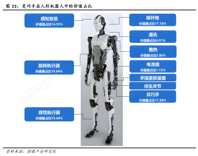 灵巧手在人形机器人中的价值占比较为可观。灵巧手的硬件和软件研发门槛极高,是机器人领域的技术制高点之一。人类手部有27个自由度(5指×3关节+腕部),仿生灵巧手通常需实现12-20个自由度,需在极小空间内集成微型电机、齿轮、腱绳等部件。根据前瞻产业研究院数据,灵巧手在人形机器人成本占比达到17.98%,仅次于旋转执行器和线性执行器。另外,考虑到减重等问题,轻量化(碳纤维、钛合金)与高强度(抗冲击、耐磨)材料的结合将会更进一步提升价值占比。