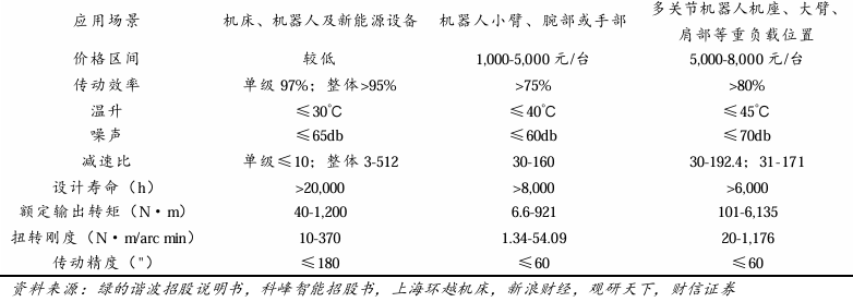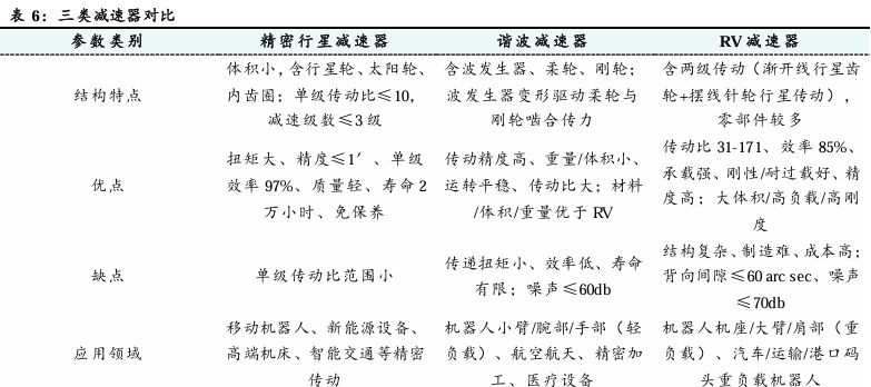 三类减速器各有优劣,目前并无明显替代关系。谐波减速器具有单级传动比大、体积小、质量小、运动精度高并能在密闭空间和介质辐射的工况下正常工作的优点。且与一般减速器比较,在输出力矩相同时,谐波减速器的体积可减少2/3,重量可减轻1/2,这使其在机器人小臂、腕部、手部等部件具有较强优势。RV减速器传动比范围大、精度较为稳定、疲劳强度较高,并具有更高的刚性和扭矩承载能力,在机器人大臂、机座等重负载部位拥有优势。不过,谐波减速器的负载轻,容许力矩负载在1,500N·m以内,因此限制了其向重负载部位拓展的可能。而RV减速器容许力矩负载可达8,000N·m,其重量重、外形尺寸较大的特性,也使其无法向轻便、灵活的轻负载领域发展。此外,RV减速器零部件数量多、制造和装配难度大,不利于大规模生产。而行星减速器凭借行星轮系结构实现高传动效率(97%以上)和紧凑设计,虽单级传动比范围有限,但通过多级组合可满足直角坐标机器人、新能源设备等中负载场景的精密传动需求。