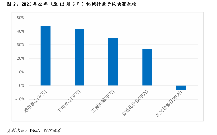 子板块中,通用设备表现最好,轨交设备表现最差。机械行业二级子板块中,2025年涨跌幅排名为通用设备、专用设备、工程机械、自动化设备、轨交设备Ⅱ,涨跌幅分别为43.93%、41.93%、34.97%、27.12%、-3.31%。
