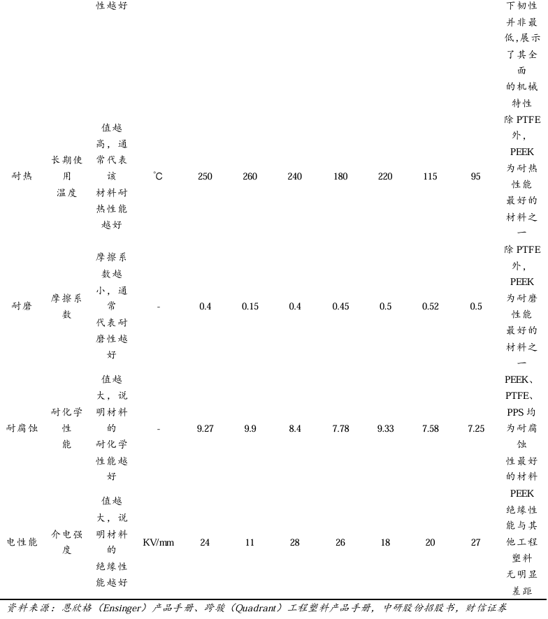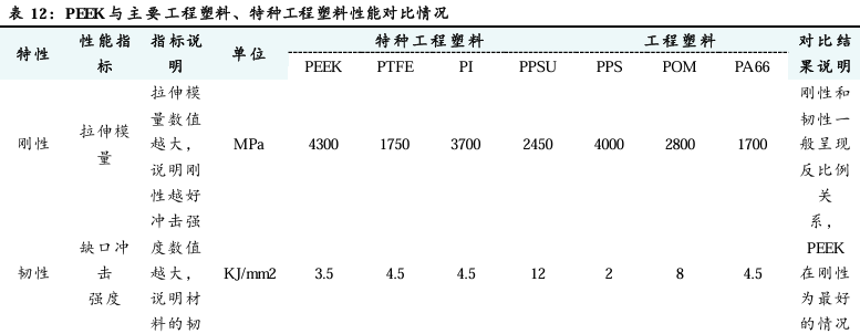 在材料性能方面,PEEK相较于其他工程塑料具备显著优势。从PEEK与主要工程塑料、特种工程塑料的对比情况可以看出,PEEK性能全面,在刚性方面优于绝大多数特种工程塑料的同时,也兼具韧性,展现了全面的机械性能,此外在耐热、耐磨、耐腐蚀等方面均表现优异。因此,PEEK是公认的全球性能最好的热塑性材料之一。