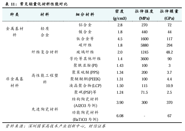 轻量化:人形机器人轻量化重要性显著,是提升其实际性能的核心因素。轻量化是人形机器人重要发展方向。国内厂商方面,宇树科技,优必选,智元机器人等企业均在新一代产品中逐步降低重量,而在续航或移动速度等方面均有所提升。而海外厂商方面,特斯拉在2023年12月发布的第二代Optimus原型机成功将整机质量由首代Optimus的73千克降至63千克,降幅达13.7%。Figure在其最新发布的Figure 03机器人中采用了多层软质材料和防夹结构,重量较上一代下降10kg。轻量化的核心逻辑是使用采用密度更低的轻质材料。当前主流方案包括铝合金、镁合金、高性能工程塑料和碳纤维复合材料。PEEK材料由于其物理性能优越,有望成为轻量化最终选择。