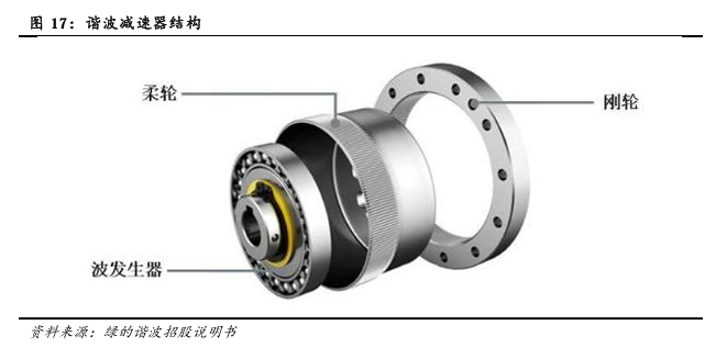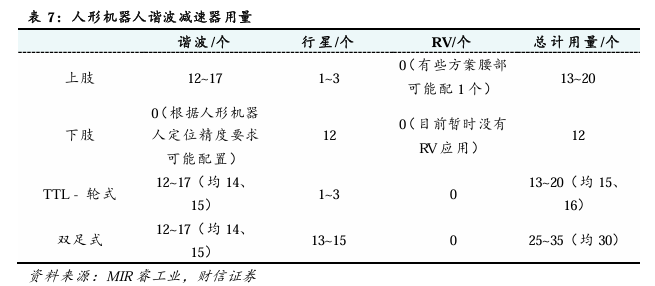 在人形机器人领域,精密减速器作为核心零部件之一,使用量较多,且当下以谐波减速器为主。为实现各类动作(如行走、搬运、平衡等),人形机器人通常采用“电机+减速器”组合的驱动关节,减速器可解决电机扭矩不足问题,满足动作精确、稳定、结构紧凑等需求。其中由于机械机构不同,轮式机器人使用的减速器数量少于双足式机器人,根据MIT睿工业的数据,双足式机器人的减速器预计用量为25-35个,而轮式机器人减速器预计用量为13-20个。