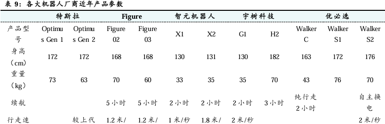 海外巨头方面:特斯拉通过系统性轻量化设计显著提升了其第二代Optimus机器人的运动性能与能效。在2023年12月发布的第二代Optimus原型机中,其在颈部增加了两个运动自由度,同时通过应用轻量化材料、进行结构拓扑优化及减少冗余设计,成功将整机质量由首代Optimus的73千克降至63千克。这一系列轻量化措施,结合第二代关节更高的集成度与能效优化,共同支撑了机器人行走速度30%的性能提升。Figure在其最新发布的Figure 03机器人中采用了多层软质材料和防夹结构,重量较上一代下降10kg。