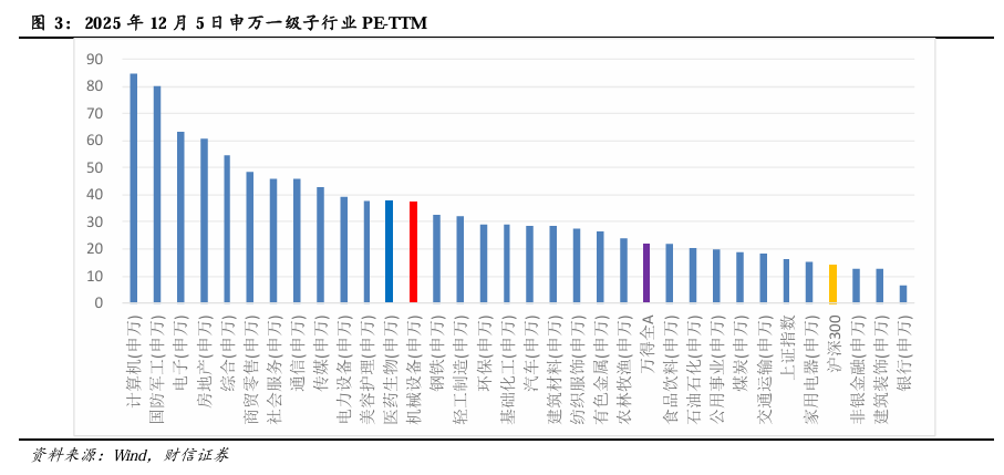 估值方面,以2025年12月5日的数据,机械设备(申万)的PE(TTM)为37.27倍,在31个一级行业中排行第13,处于中等偏上位置。与此同时,沪深300的PE(TTM)为14.02倍,万得全A的PE(TTM)为21.79倍。