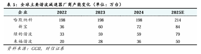 过去几年全球范围内谐波减速器产能的扩充主要发生在中国。2024年10月,日本电产(尼得科)在中国浙江省平湖市的工厂正式启动谐波减速机的量产,主要应用于机器人关节。预计到2025年夏季,该工厂的月产能将达到2万台。这一产能扩张旨在满足中国机器人市场快速增长的需求,同时通过本地化生产降低成本。2023年,绿的谐波募投项目顺利达产,年产能达到了59万台。2025年,绿的谐波计划启动新一代精密传动装置智能制造项目,预计将新增谐波减速器100万台、机电一体化产品20万台的年产能。2025年,来福谐波新厂房开始投用,投产后年产能预计将提升至50万台。