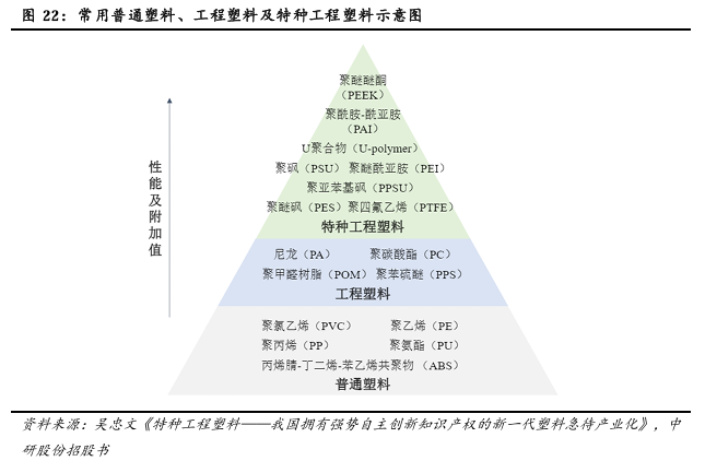 PEEK(聚醚醚酮)作为特种工程塑料金字塔顶端的材料,是“以塑代钢”的优选材料。PEEK属于特种工程塑料的一种。特种工程塑料是20世纪60年代后期发展起来的一类高分子新材料。从1960年聚酰亚胺的最初问世到1978年PEEK问世的近20年间,欧美各大公司先后投入了大量人力、财力对特种工程塑料进行研发,虽然论文发表的品种不下几十个,但最终真正有应用价值并实现产业化的不足10个。这些特种工程塑料在性能、商业价值上都处于工程塑料的顶端。PEEK密度仅为1.3g/cm³,约为铝合金的一半,但比强度却达到铝合金的8倍,在满足结构强度要求的前提下可实现显著减重。