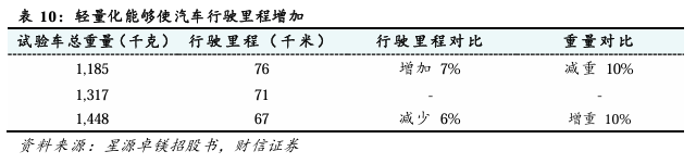 机器人和汽车逻辑相似,减重能够降低负载,继而提高续航能力。参考星源卓镁招股说明书,奇瑞汽车实车测试数据显示,新能源汽车减重10%,平均续航能力增加5%-8%。在市区的运行工况下,平均车重1600千克的新能源汽车如果减重20%,能量消耗可以减少15%。