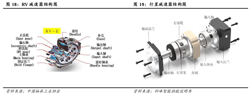 RV减速器则在传统针摆行星传动基础上发展而来。由摆线针轮和行星支架组成,采用两级传动结构,具有高刚度、抗冲击能力强、传动平稳、精度高等优点。传动比范围广,能承受大扭矩,但缺点是重量重、外形尺寸较大、制造工艺复杂。例如RV-E是两级减速齿轮,第一级减速是输入齿轮和正齿轮的外啮合,三个正齿轮(spur gear)以120°的间隔对称于输出轴。第二级减速透过正齿轮驱动偏心轴,带动安装在偏心轴上的RV齿轮,引起两个RV齿轮的偏心运动。两个RV齿轮以180°的相位差带动输出轴,以提供平衡载荷。RV减速器多适用于20公斤以上机器人的机座、大臂、肩部等重负载位置,如汽车制造、港口码头等重工业场景。