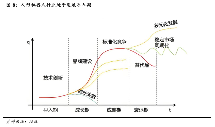 我们认为人形机器人是继电脑、智能手机和新能源汽车后的另一个颠覆性产品的赛道。根据行业生命周期理论(Industry Life Cycle),行业的生命发展周期主要包括四个发展阶段:幼稚期,成长期,成熟期,衰退期。我们认为人形机器人目前尚处于发展的导入期即幼稚期,行业格局尚不明朗,在社会发展背景的需求下以及产品、产业和政策等条件的促进下商业化落地将加速。