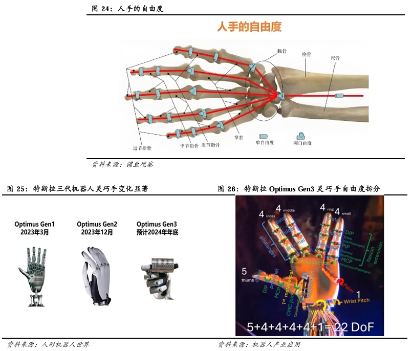 三代特斯拉Optimus在灵巧手方面有显著提升。根据人形机器人世界公众号报道,2022年9月特斯拉推出人形机器人原型机Bumblebee(大黄蜂),半年后发布Optimus(擎天柱)第一代产品。特斯拉第三代灵巧手的单手自由度(DOF)由第二代的11个提升至22个(其中手腕/前臂具备3个自由度),主动自由度(DOA)由第二代的6个提升至13-17个,成为最接近人手自由度的灵巧手之一。经过两年时间的迭代,特斯拉灵巧手的自由度不断提升,第三代产品的主要更新包括将执行器外置在前臂,采取空心杯电机、行星减速器、丝杠及腱绳驱动系统,并加强触觉传感器方案,整体能力实现大幅增强。OptimusGen3的灵巧手由5根手指构成,每根手指拥有4个自由度,再加上腕部的2个自由度,共计22个自由度。如此设计高度模拟人类手指结构,让Optimus在原有屈曲、伸展动作基础上,还能做出外展、内收等精细动作。
