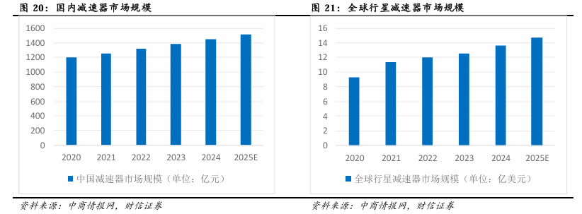减速器作为工业传动的“关节”,其性能直接影响机械系统的效率与精度,市场空间持续增长。近年来随着国家产业政策的支持和下游市场需求的不断增长,我国减速器市场规模呈现持续增长态势。中商产业研究院的数据显示,2024年中国减速器行业市场规模约1448亿元,较上年增长4.4%。中商产业研究院分析师预测,2025年中国减速器市场规模将增长至1510亿元。而在行星减速器领域,由于其技术含量高,生产工艺复杂,存在较高的进入壁垒,目前市场主要参与者为外资厂商、合资厂商,高端精密行星减速器国产化率很低。中商产业研究院的数据显示,2023年全球行星减速器销售额约12.55亿美元,2024年销售额约13.67亿美元。而2025年全球行星减速器销售额有望增至14.71亿美元。