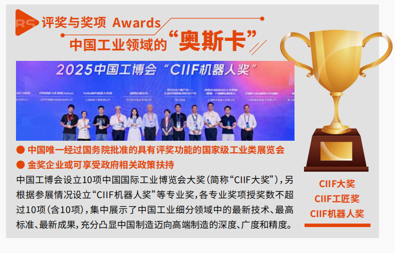 CIIF 机器人奖评选:中国唯一经国务院批准的国家级工业类评奖,被誉为 “中国工业领域的奥斯卡”,金奖企业可享受政府政策扶持,10 项限额奖项聚焦行业顶尖成果,助力企业树立技术标杆;