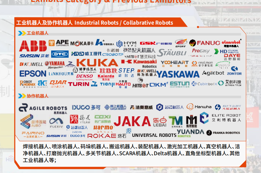 历届展商:FANUC、DENSO、新松、中大力德、JAKA、FRANKA ROBOTICS、KEENON 等行业标杆企业。