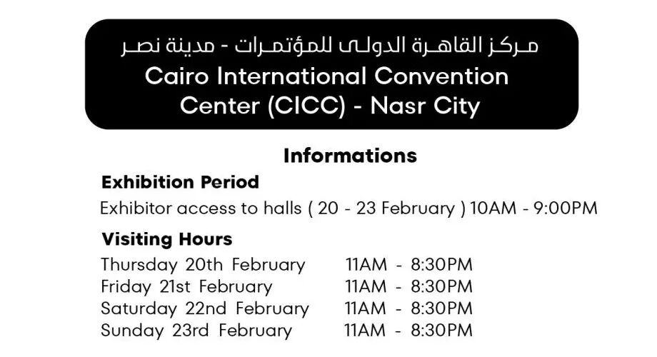 展会地址:2 El-Nasr Rd, Al Estad, Qesm Than Madinet Nasr, Cairo.