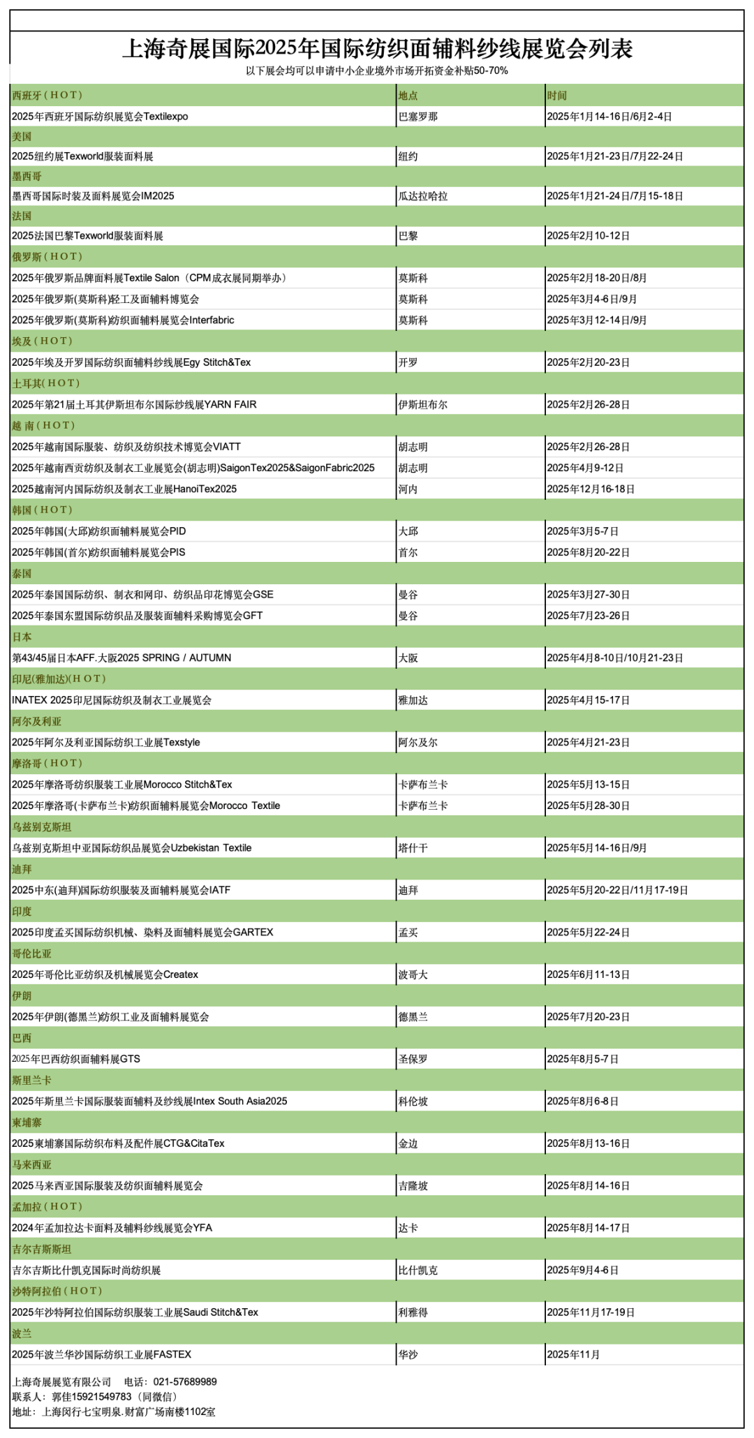 尊敬的各位展商,欢迎贵司参加上海奇展国际组织的埃及stitch&tex2025和fabric&yarn2025。展团出发在即,为了确保大家顺利有序的参加本届展会,现将展会的相关信息和出展重要事项通知大家,请您认真查阅!同时祝愿此次展会取得圆满成功!