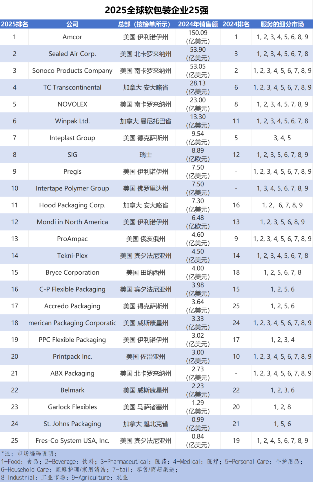 《Flexible Packaging》杂志发布的“全球软包装企业25强”榜单,不过显然这份榜单具有局限性,亚洲软包装巨头竟然都不在其列