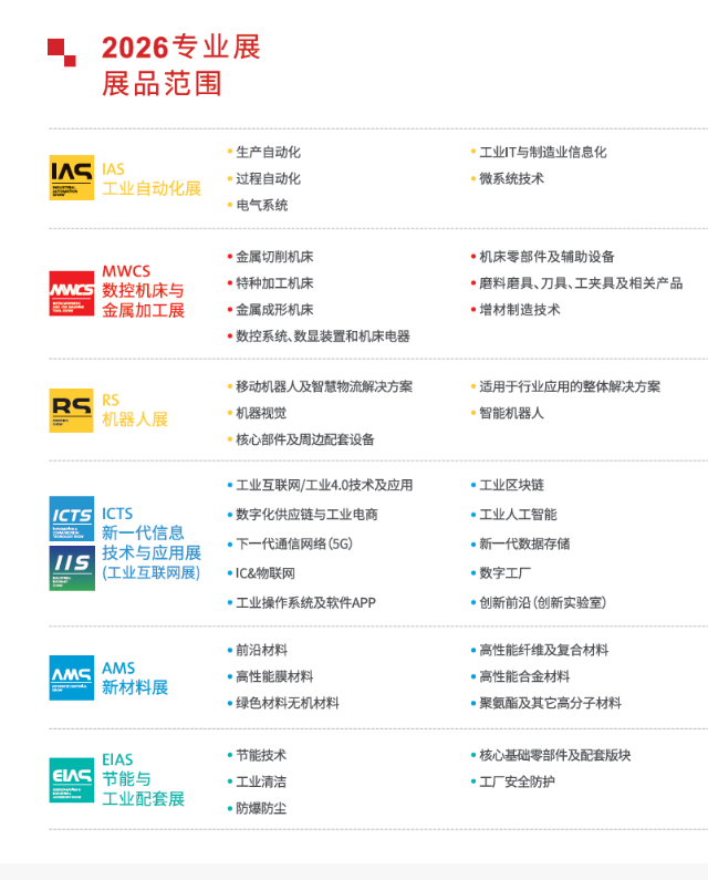 涵盖金属切削机床、特种加工机床、金属成形机床、数控系统 / 数显装置和机床电器、机床零部件及辅助设备、磨料 / 刀具 / 工具 / 夹具及相关产品、增材制造技术等