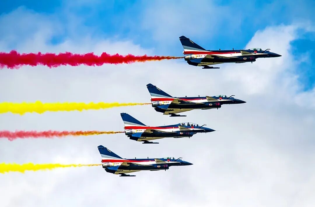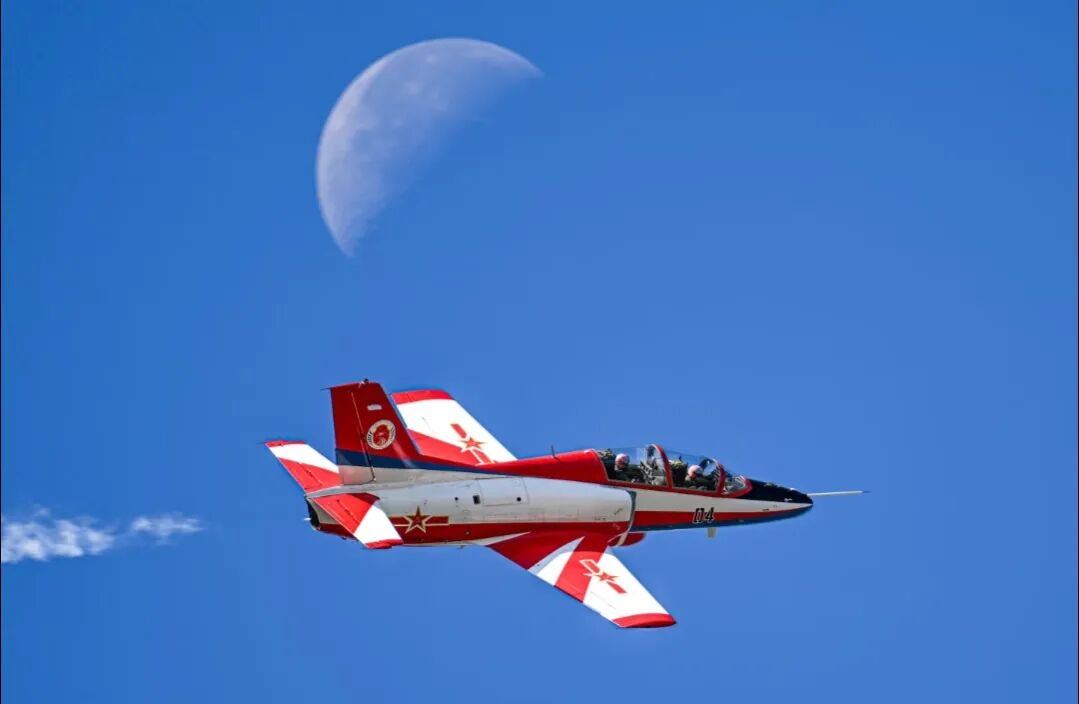 上午10点左右,天空中传来一阵低沉而有力的轰鸣声,人群瞬间安静下来,所有人都仰起头,目光紧紧锁定天空。一架架战机如矫健的雄鹰,排着整齐的队列,从远方飞来。率先登场的是空军航空大学“红鹰”飞行表演队的教 - 8战机,它们以精准的默契和高超的技艺,在空中划出一道道绚丽的弧线,五彩的烟带如同彩虹般绚丽,引得现场观众阵阵惊叹。紧接着,运油 - 20A单机与歼 - 16双机加油编队通场,展示了我国强大的空中加油能力,彰显着空军远程作战实力的飞跃。看着它们紧密配合,我不禁感叹祖国航空技术的飞速发展,这背后是无数科研人员日夜的辛勤付出,是国家对航空事业坚定的支持。