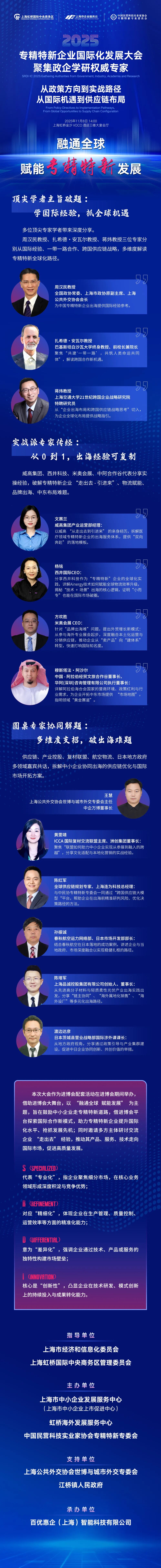 作为进博会的重要配套活动,2025 专精特新企业国际化发展大会将于 11 月 8 日下午14:00举办,以“融通全球 赋能发展”为主题,与进博会推动开放合作、共享发展机遇的理念高度契合,成为展示专精特新企业践行国家开放战略的特色平台。