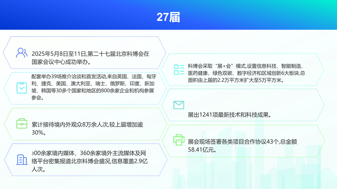中国北京国际科技产业博览会(简称“科博会”)源于1998年由科技部、商务部、教育部、工业和信息化部、国务院国资委、中国贸促会、国家知识产权局和北京市政府联合主办的中国北京高新技术产业国际周,2002年正式命名为中国北京国际科技产业博览会,是中国首个以科技为主题的大型国际交流合作展会,迄今已成功举办27届,执行单位首都会展(集团)有限公司。