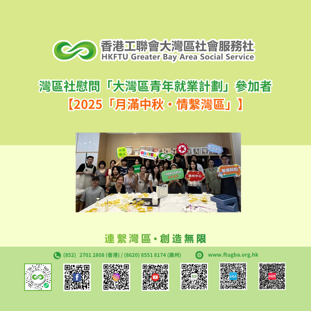 中秋佳節將至,為向在大灣區內地城市就業的香港青年傳遞關懷與溫暖,香港工聯會大灣區社會服務社(下稱灣區社)於9月開展了兩場「大灣區青年就業計劃」(下稱「計劃」)參加者慰問活動。