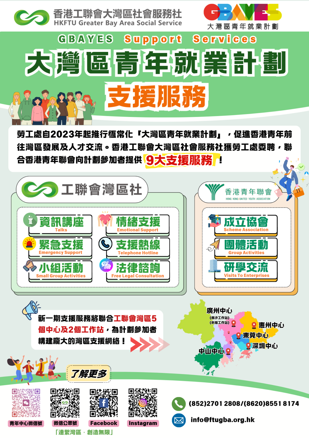 灣區社會持續升級各項支援服務,並將聯同工聯會在灣區的五間中心和兩個工作站,構建龐大灣區支援網絡,讓各地的參加者都能得到充分支援!